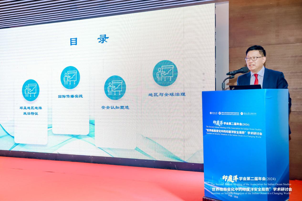 印度洋学会第二届年会(2024)暨“世界格局变化中的印度洋安全局势”学术研讨会主旨发言由印度洋学会副会长、深圳大学区域国别与国际传播研究院院长、深圳大学外国语学院院长戴永红教授主持并作《国际传播视域下环孟加拉湾地区的安全塑造与合作治理》主旨演讲。