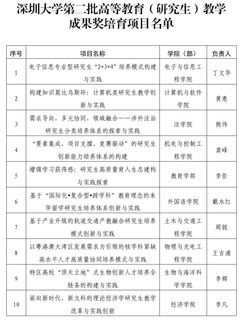 3、深圳大学第二批高等教育(研究生)教学成果奖培育项目名单
