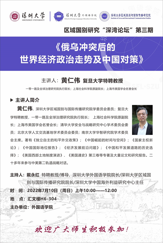 On the morning of July 10, 2022, Professor Huang Renwei, Distinguished Professor of Fudan University, Executive Director of the Belt and Road and Global Governance Research Institute, former Vice President of the Shanghai Academy of Social Sciences, Honorary President of the American Society in Shanghai, and member of the Academic Committee of the Institute of Regional Countries and International Communication of Shenzhen University, visited Shenzhen University and gave a lecture titled “World Economic and Political Trends and China's Countermeasures after the Russia-Ukraine Conflict” to students and faculty members of the School of Foreign Languages, the Institute of Regional Countries and International Communication of Shenzhen University. H6-304, Huiwen Building, Yuehai Campus, to give a lecture entitled “World Economic and Political Trends and China's Countermeasures after the Russia-Ukraine Conflict” to the teachers and students of the School of Foreign Languages, the Institute of Regional and National Studies and the Institute of International Communication. The forum was hosted by Prof. Dai Yonghong, Dean of the School of Foreign Languages, Director of the Institute of Regional and National Studies and International Communication, and Director of the Research Center for China's Overseas Interests.