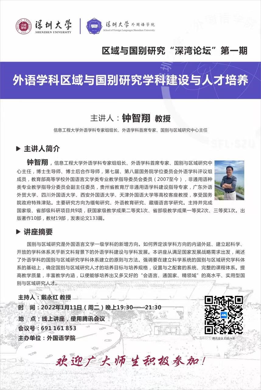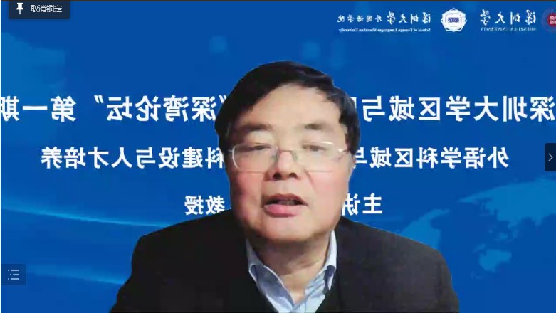 introduction:On the evening of January 11, 2022, Prof. Zhong Zhixiang of Information Engineering University gave a lecture entitled “Construction and Talent Cultivation of Regional and Country Studies in Foreign Language Disciplines” for teachers and students of SZU through Tencent Conference, talking about the connotation and positioning of the discipline of country and regional studies, the principles and methods of construction of the discipline system, the objectives and design of teaching system and reform of teaching content of undergraduates practical country and regional talent cultivation. The lecture is a part of Shenzhen University's Regional and Country Studies Program. This lecture is the opening lecture of the “Deep Bay Forum” on regional and country studies of Shenzhen University.